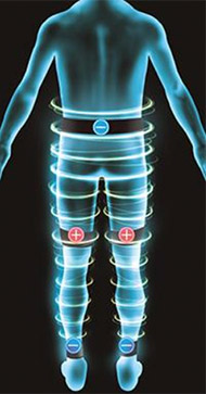 従来の電気刺激法とは異なり、電極を腰や脚に巻き付けるベルト電極を使用することにより(図参照)、全身の約60%を占める腰から下の筋収縮に参加する筋量の増加を可能とした新しい治療法です。 既に廃用性筋萎縮の改善や糖代謝に与える効果が明らかにされております。